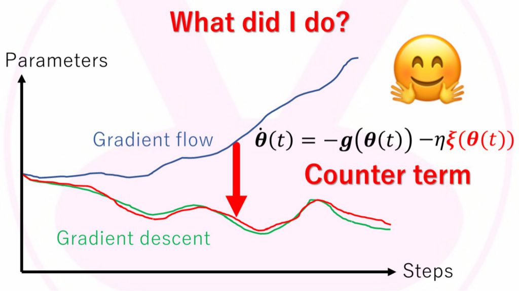 にありました。微分方程式の数値シミュレーションでは、0の極限はコンピューター上で扱えないので、微分を有限のϵで近似計算する必要があります(有限差分法)。この近似による誤差を離散化誤差とここでは呼びます(図2)。その離散化誤差を打ち消す研究が長年に渡って積み重なってきていました。詳細は省略しますが、この離散化誤差を打ち消す項を上述の勾配流に導入することで、深層ニューラルネットワークの学習過程を一切の誤差無しに説明できる微分方程式、すなわち深層ニューラルネットワークの運動方程式を導出することに成功したのです(図3)。