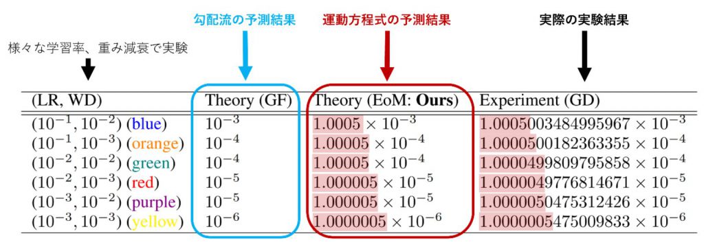 この表を見ると、勾配流の予測結果よりも、運動方程式の予測結果の方が、実際の実験結果をすさまじい精度で予言できていることがわかりますね(たった0.0000005の違いすら見逃していません!)。