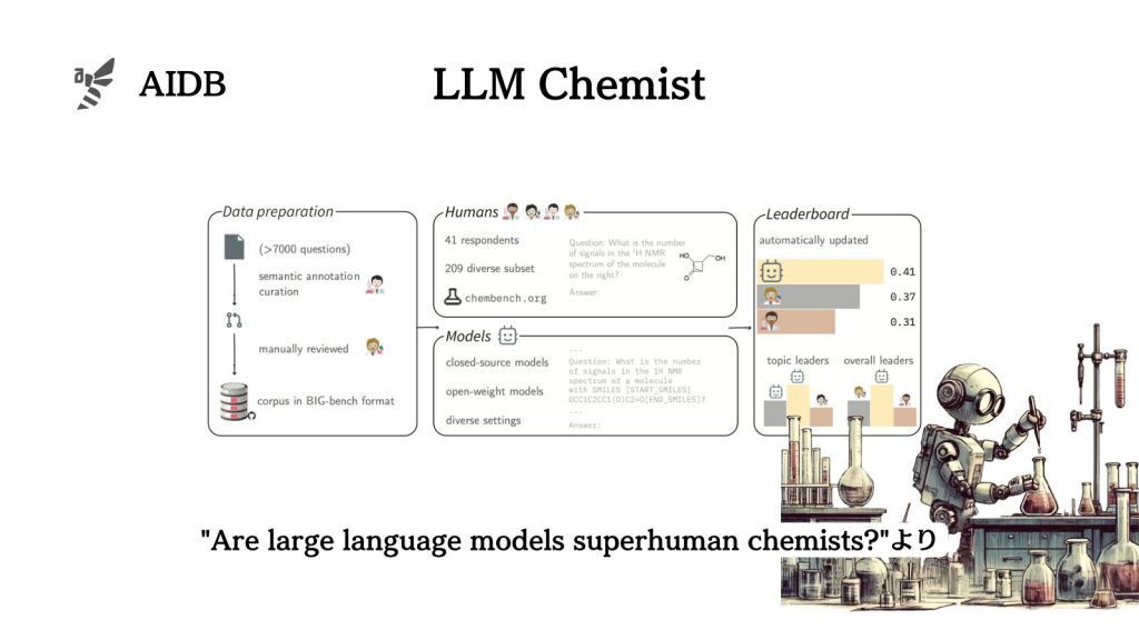 研究者たちは「ChemBench」という評価システムを作り、様々なLLMの化学知識や推論能力をテストして報告しています。