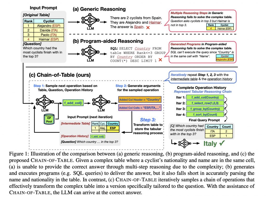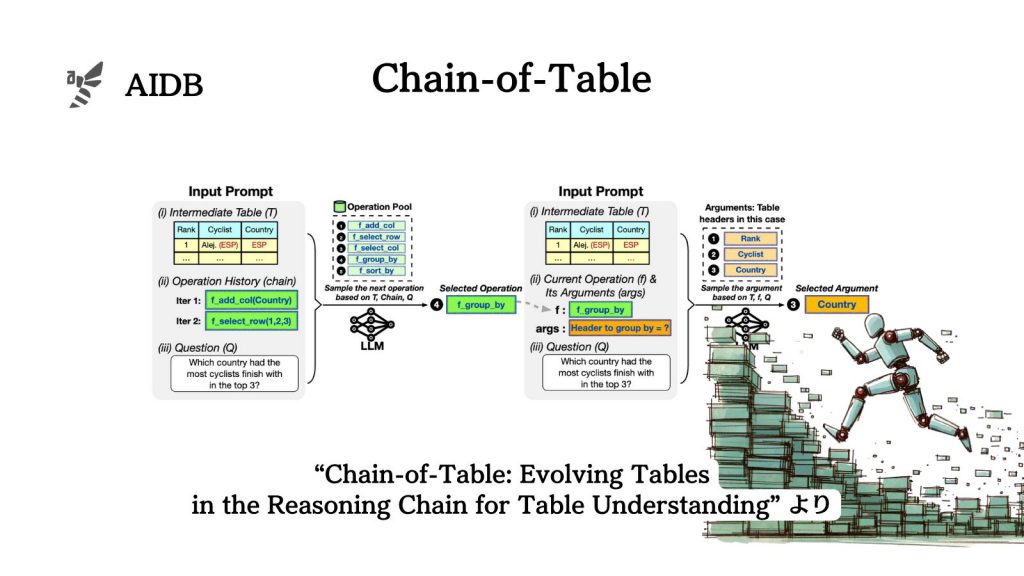 Googleなどの研究者により、表形式(.csvなど)のデータを通してLLMが「連鎖的な推論」を行うためのフレームワークが考案されました。ユーザーがプロンプトによってLLMに表データを段階的に更新させ、表データの正しい理解に基づいた回答を引き出します。