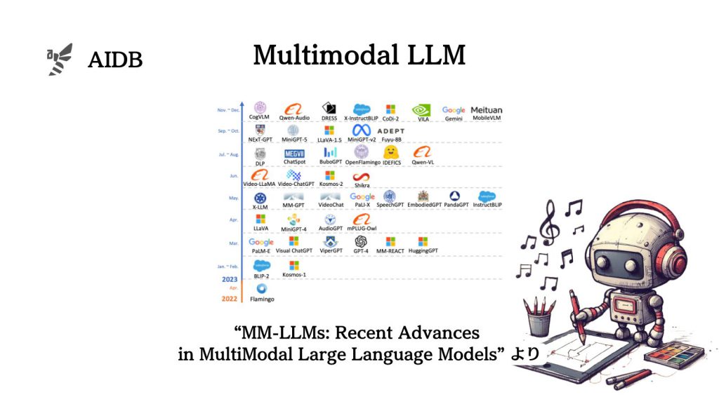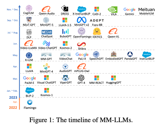 なお下記の図はマルチモーダル大規模言語モデル(MM-LLMs)の発展を示しています。2022年初頭から2023年末まで、短期間に多くの新しいモデルが導入されていることがわかります。