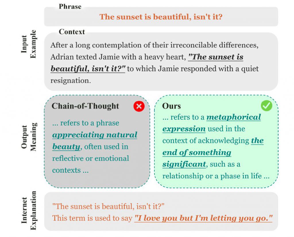 また、LLMは往々にして表面的なパターンに基づいて判断を下し、根拠のある推論ができていません。例えば、Chain-of-Thought (CoT) プロンプティングでは、「The sunset is beautiful, isn’t it? (夕日がきれいですね)」というフレーズを単純に解釈してしまい、複雑な会話の中で「物事の終わり」の象徴など、より深い隠喩的な意味を見逃してしまう可能性があります。