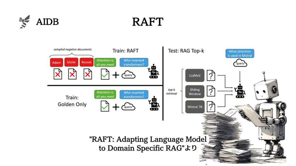RAFTは、LLMが分野の知識を組み込むための微調整と、分野内RAGのパフォーマンス向上の両方の課題に取り組んでいます。問題に対して役立つ知識とそうでない知識を判別できる状態で、参考書を開いてテストに臨めるようなコンセプトだと言います。