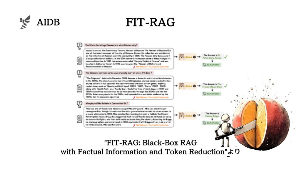 RAGを効率化する新しいフレームワーク「FIT-RAG」が提案されました。FIT-RAGでは、不必要な拡張を避け、トークン数をできる限り削減します。