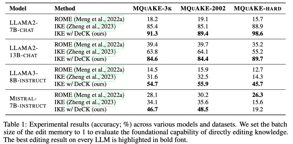 MQuAKEデータセットを使用して実験を行い、LLM(LLaMAモデルを中心に)の編集精度を評価しました。結果として、DeCKは従来のコンテキスト内編集手法に比べて最大219%の性能向上を示しました。
