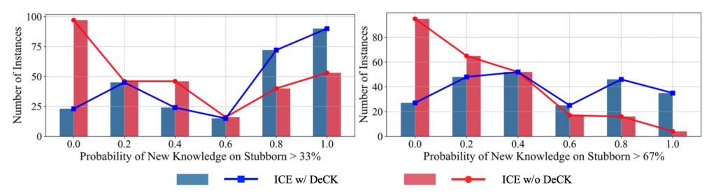 DeCKは、新しい知識に対するLLMの信頼度を大幅に向上させ、編集精度を劇的に改善することが確認されました。なお、私たちが構築した頑固な知識(stubborn knowledge)のデータセットにおける確率統計において、さらに詳細に説明されています。
