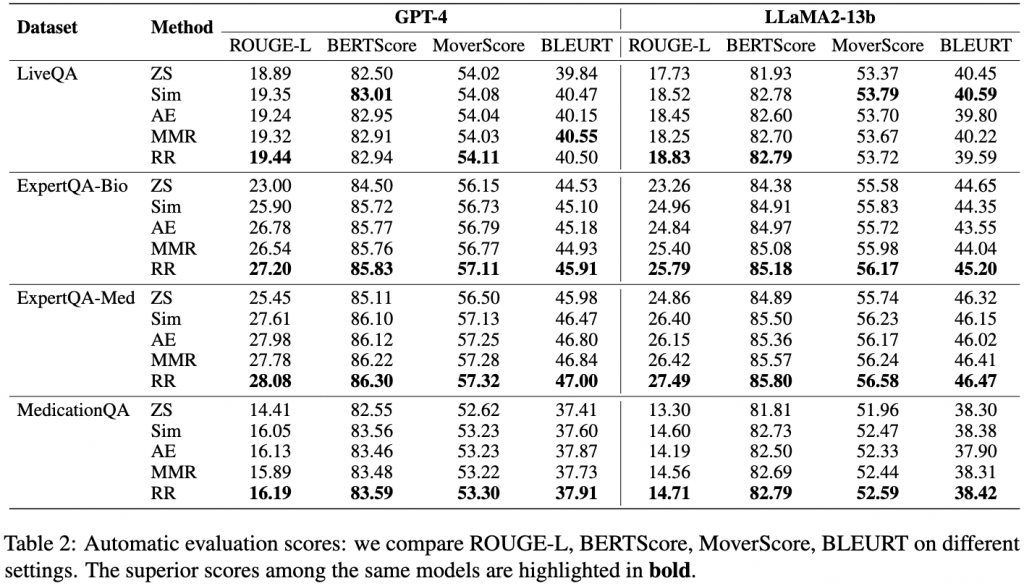 上の表(表2)では、複数の医療QAベンチマークにおける実験結果を示しています。評価には、ROUGE(Recall-Oriented Understudy for Gisting Evaluation)などのテキスト生成メトリクスを使用しました。ベースとなるLLMとして、GPT-4およびLLaMa2の結果を報告しています。注目すべきは、RR(Re-Ranking:再ランキング)設定が、ほとんどの状況下で最良の結果を達成したという点です。