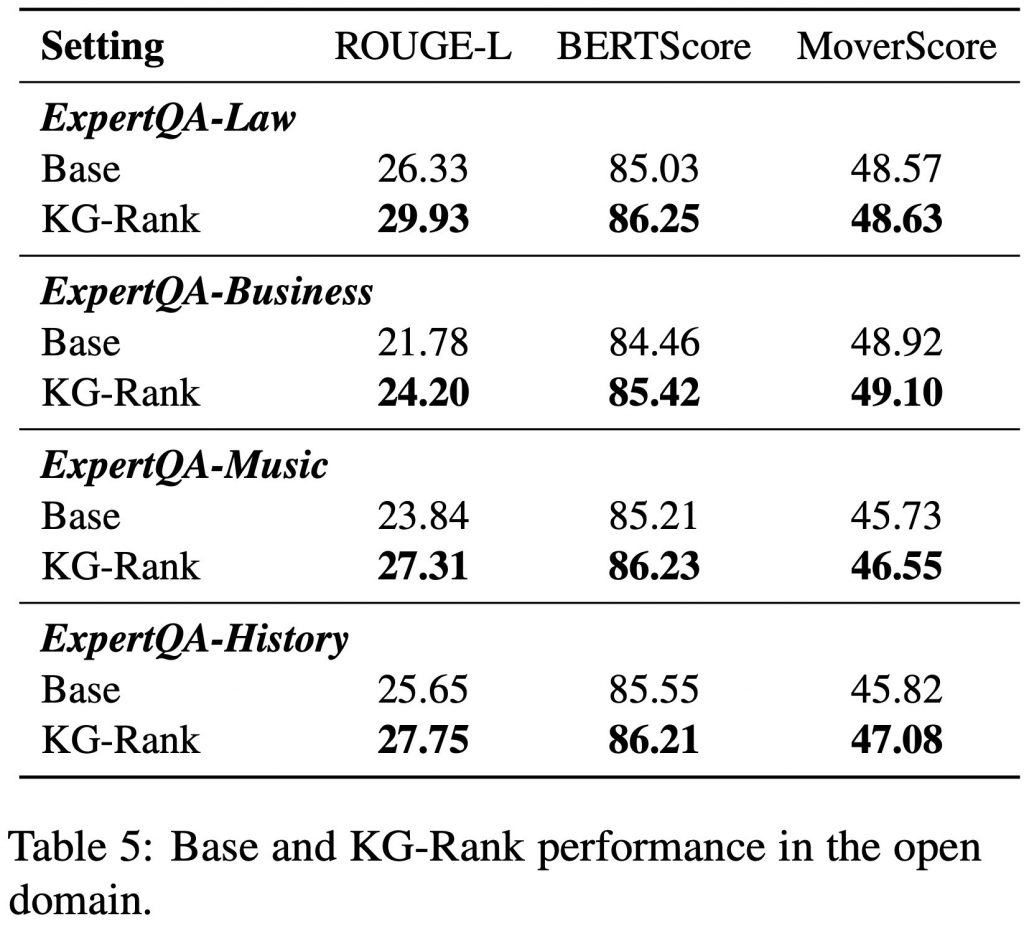 また、本手法の汎用性を検証するため、オープンドメインにおいてもテストを実施しました。ベースモデル(GPT-4)と比較すると、KG-Rankを適用することで、回答の質が顕著に向上することが確認されました(上の図)。
