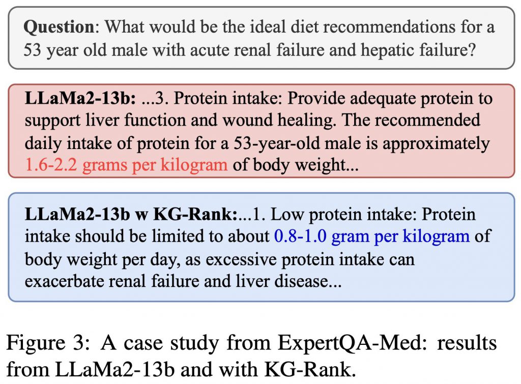上の図(図3)には、医療に関する質問のケーススタディを提示しています。KG-Rankを使用しない場合、LLaMaはタンパク質摂取量に関して誤った数値を出力しています(赤色で強調表示)。一方、私たちが提案する手法では、正確な数値が提示されています(青色で強調表示)。この改善の過程をより詳細に理解していただけるよう、デモ動画も用意しました。