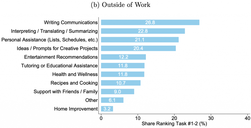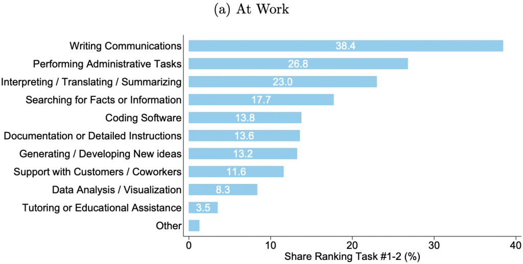 なお、業務別の利用を見ると、職場では文章作成、管理業務、テキストやデータの解釈/翻訳/要約が上位を占めました。仕事以外では、文章作成、解釈/翻訳/要約、個人的な支援が主な利用目的となっています。それぞれ下のグラフ(a)(b)でまとめられています。