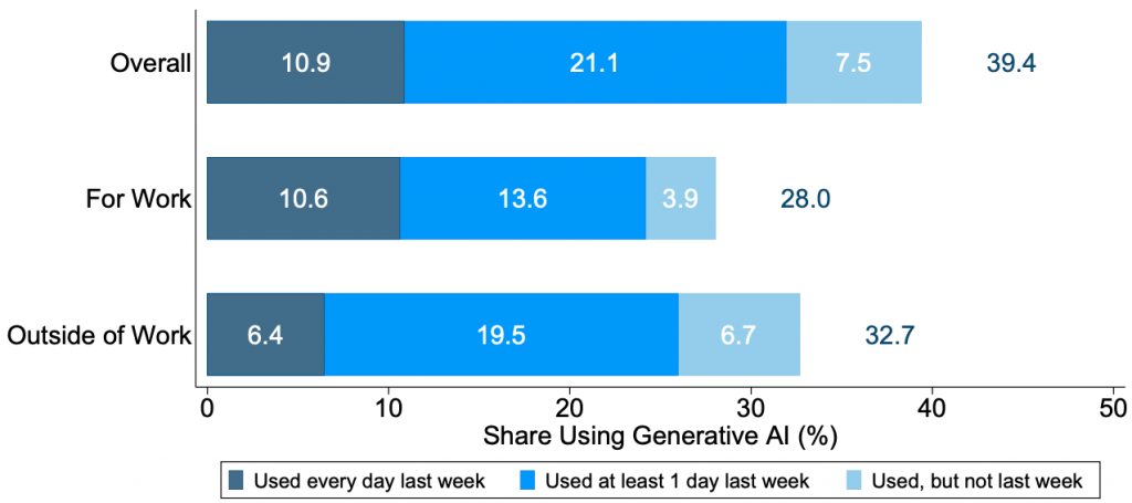 職場での利用に絞ると、雇用されている回答者の約28%が生成AIを活用していました。そのうち大多数(24.1%)が先週少なくとも1回利用し、10.9%は毎日利用していたことがわかりました。