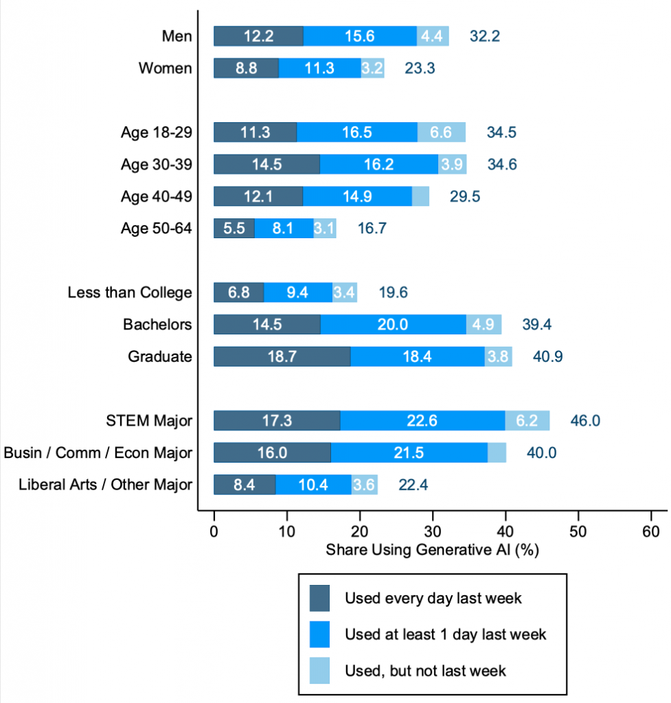 教育レベルも大きな影響を与えており、学士号以上の労働者の約40%が生成AIを活用している一方、大学卒業未満の労働者では約20%でした。大学専攻別では、STEM専攻の卒業生が最も高い利用率(46%)を示し、ビジネス・経済・コミュニケーション専攻(40%)がそれに続きました。その他の専攻(文系含む)では22%でした。