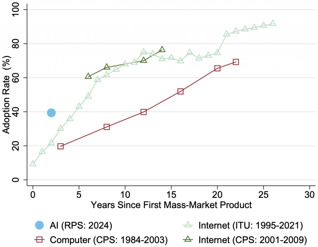 下の図は、生成AI、PC、インターネットの採用速度を比較するためのグラフです。