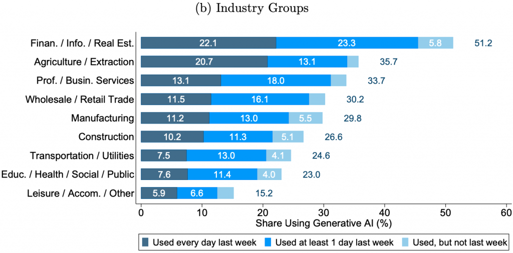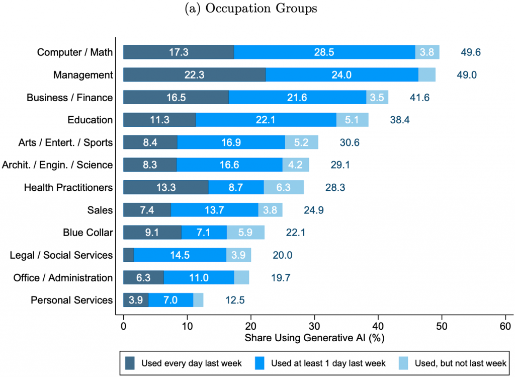 注目すべきは、個人サービス業を除く全ての主要職種グループで、少なくとも20%が利用していることです。さらに、「ブルーカラー」職の22%が職場で生成AIを活用していることも判明しました。