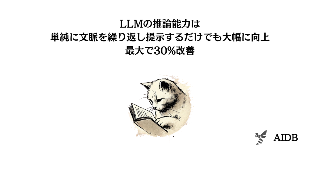 研究者らは、「文脈を繰り返し提示する」という単純な方法が、LLMの推論性能を大幅に改善することを突き止めました。LLMが「文書の順序」に対して敏感であるという問題への解決策です。
