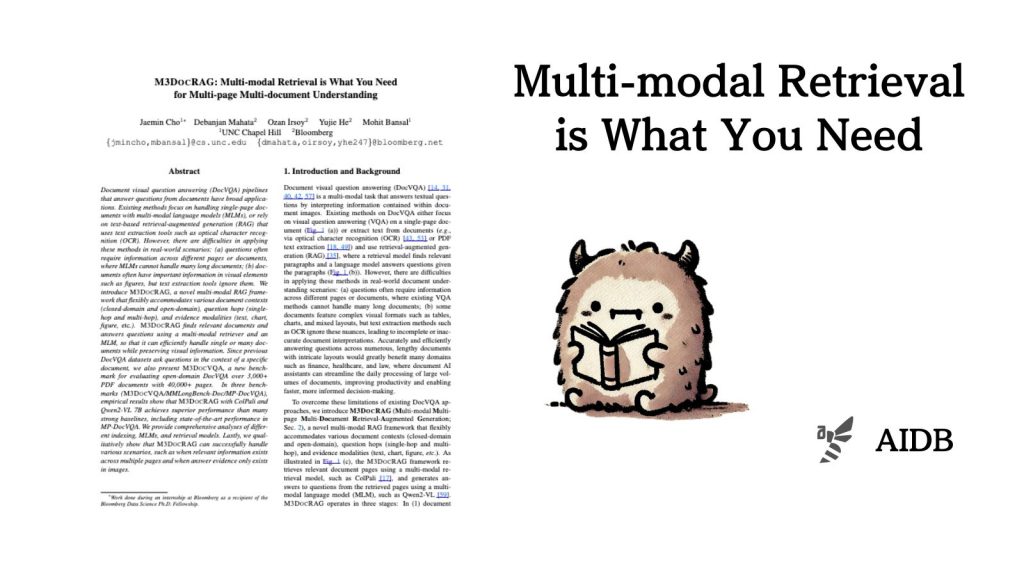 このような課題に対応するため、Bloombergなどの研究者らは、複数文書・複数ページにまたがる文書理解と、テキスト・画像を統合的に処理できるマルチモーダルなRAGシステムの開発に取り組みました。