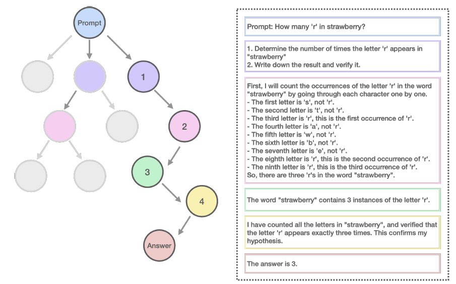 そこで、Chain-of-Thoughtファインチューニング、モンテカルロ木探索、リフレクションメカニズムといった高度な技術を組み合わせることでモデルの開発が進められました。詳細は後述します。