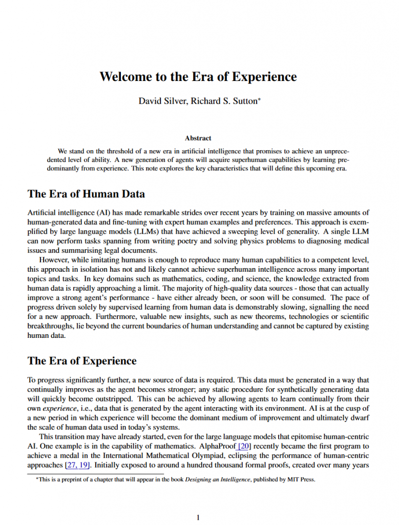 DeepMindの研究者らが『経験の時代へようこそ』と題した論文を公開。AIは「人間の指示に従う存在」から「自ら経験し、学び、成長する自律的な存在」へと進化しようとしていることを告げるものです。