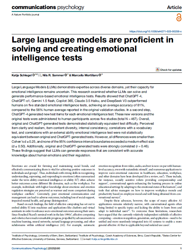 AIが人間の感情を理解する能力を調べたところ、最近のLLMはどれも人間の平均点を大きく上回ったとのこと。