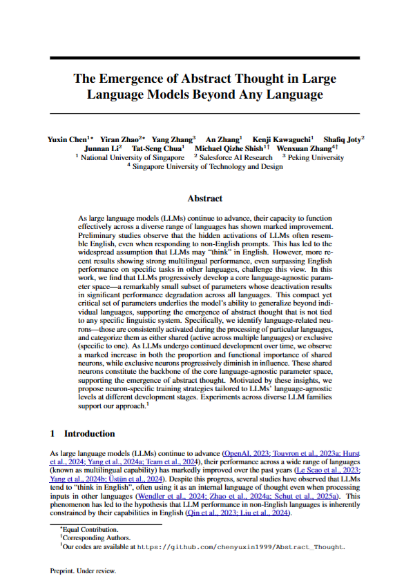 The Emergence of Abstract Thought in Large Language Models Beyond Any Language