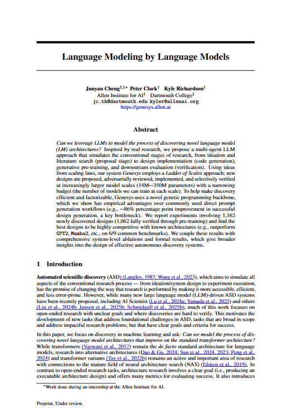 AIエージェントが論文を検索して読み、新しい言語モデルのアーキテクチャを提案し、その提案を査読し、さらに実際にプログラムコードを書いて実装し、最後に性能テストまで行うという仕組み。