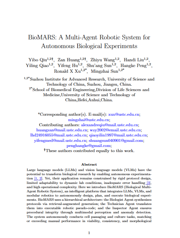 BioMARS: A Multi-Agent Robotic System for Autonomous Biological Experiments