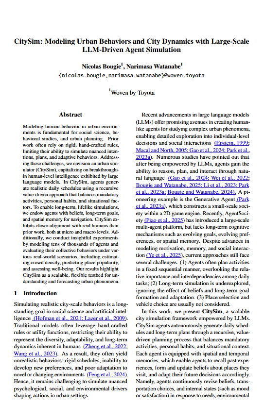 LLMで人間のように行動する仮想的な住民を最大100万人分作り出し、都市全体をシミュレーションするシステムを作ったとのこと。