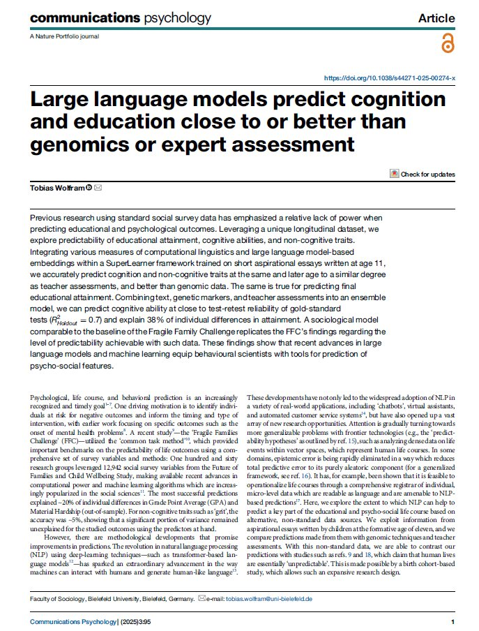 11歳の子どもが書いた250語程度の短い作文をLLMで分析すると、その子の将来の学力や教育成果を予測できることを実験的に発見したとの報告です。
