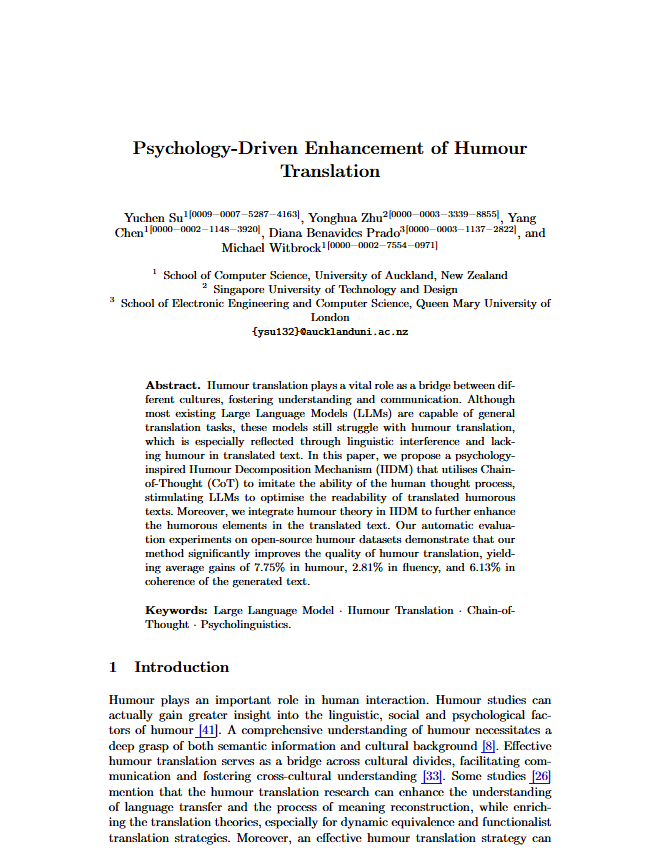 実験の結果、この方法で翻訳したジョークは、これまでのどんなアプローチよりも優れており、面白さが約8%、文章の自然さが約3%、内容の一貫性が約6%向上しました。