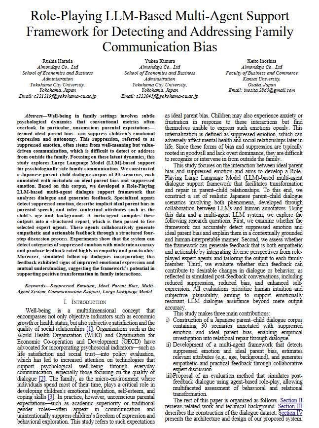 AIで「親の無意識のバイアス」と「子どもの感情抑制」を検出し、各家族に合ったアドバイスをするシステムを開発したとのことです。