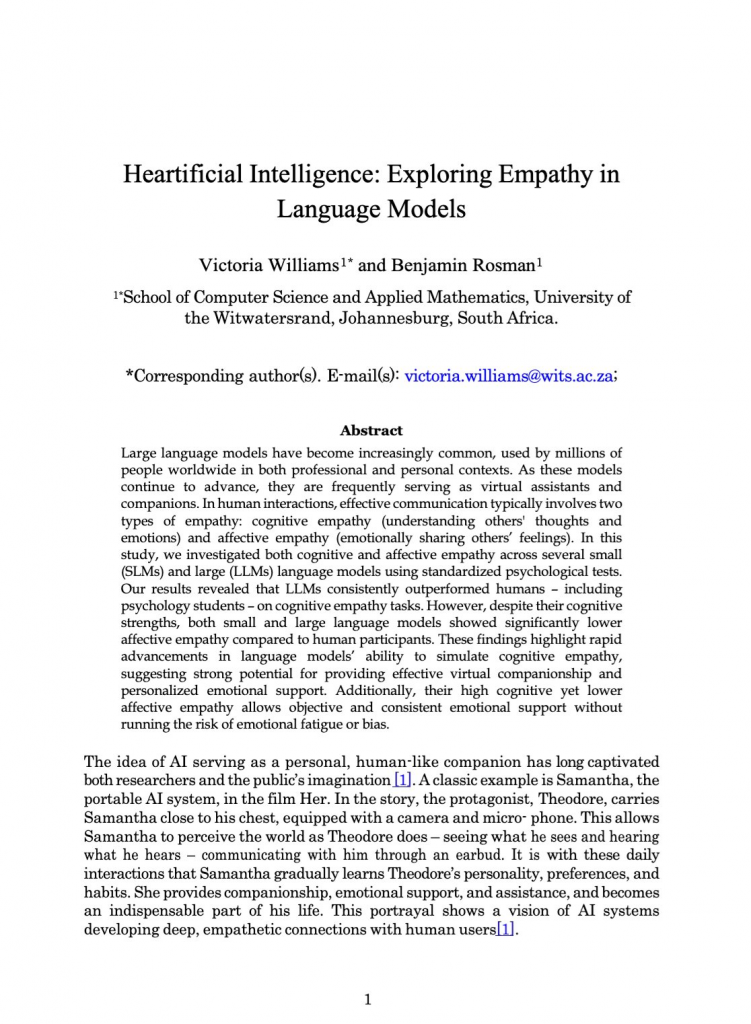 LLMと人間の「共感力」を比較した実験の結果、LLMは、とくにテキストベースの課題では人間よりも相手の気持ちを理解するのが得意だということが分かりました。 最新のモデルは心理学を学んでいる大学生よりも高い点数を取りました。 文章を読んで相手の心理状態を推測したり、目元の写真から感情を読み取ったりすることが可能です。