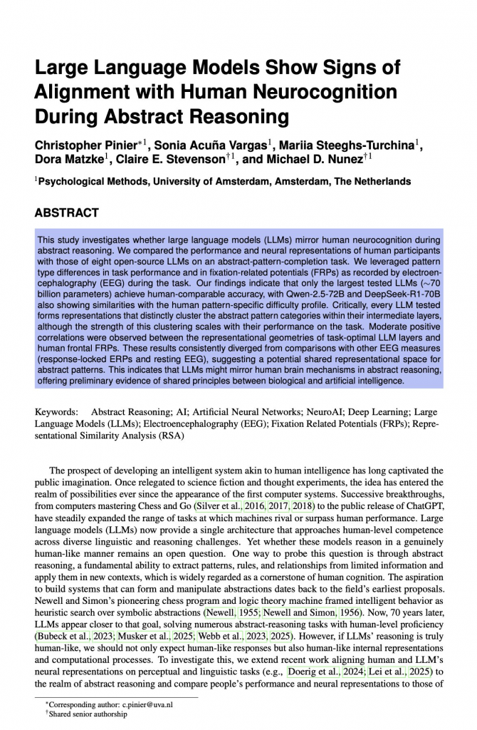 十分に大きく賢いLLMは、単に正解を出すだけでなく、人間の脳と似たような方法で抽象的な推論を行っている可能性があることが示唆されています。