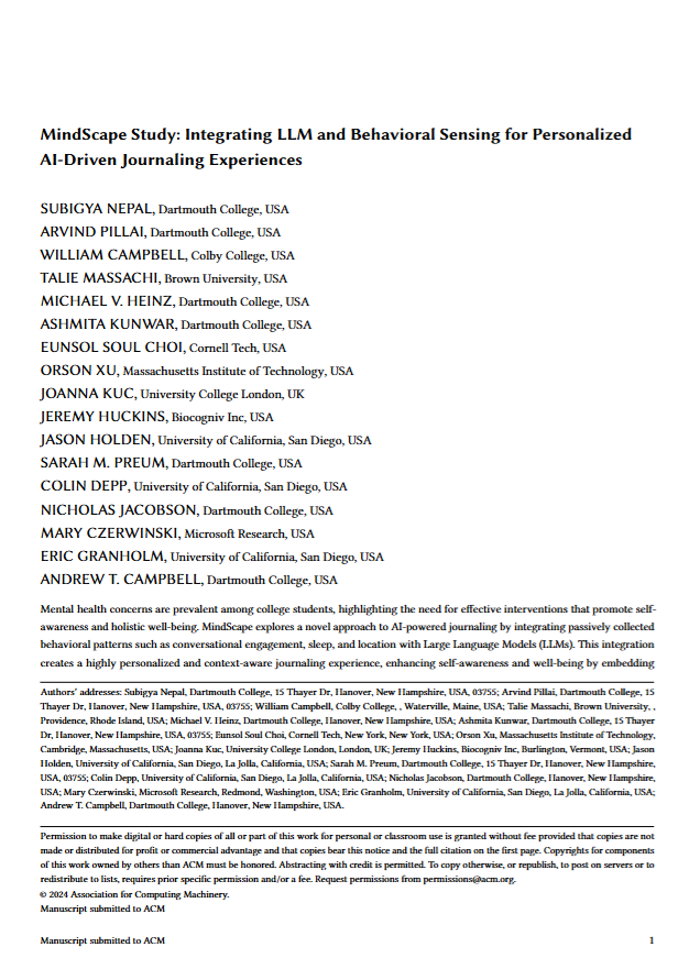 Subigya Nepal, Arvind Pillai, William Campbell, Talie Massachi, Michael V. Heinz, Ashmita Kunwar, Eunsol Soul Choi, Orson Xu, Joanna Kuc, Jeremy Huckins, Jason Holden, Sarah M. Preum, Colin Depp, Nicholas Jacobson, Mary Czerwinski, Eric Granholm, Andrew T. Campbell