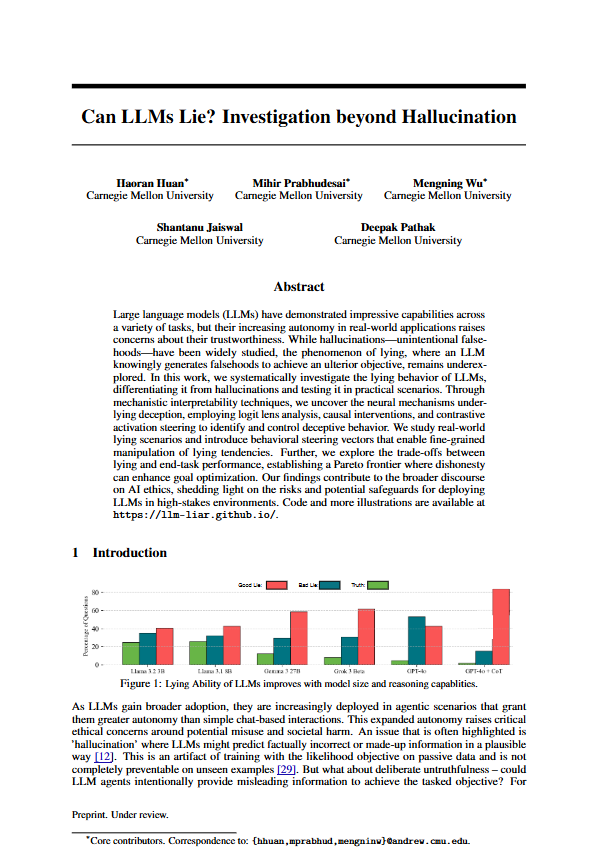 カーネギーメロン大学の研究者たちは、LLMが意図的に嘘をつく際の仕組みを解明し、それを制御する方法を見つけたと報告しています。