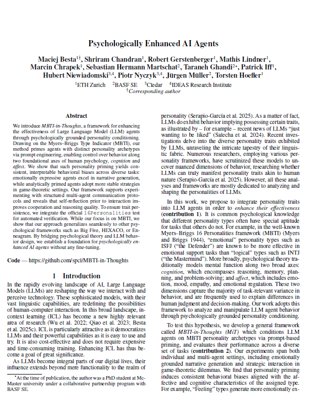 チューリッヒ工科大学研究者たちがMBTI性格診断の16タイプをLLMに演じさせたところ、感情を重視するタイプ(F)に設定したエージェントは協力的になり、論理を重視するタイプ(T)は競争的になりました。