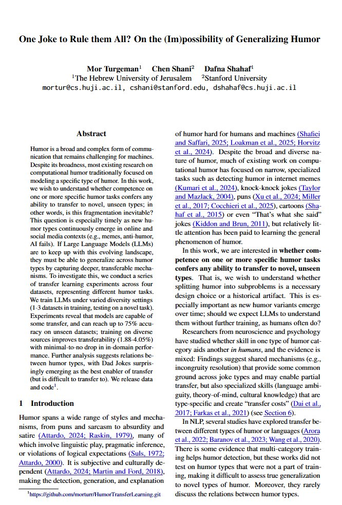 研究チームがLLMに親父ギャグを学習させたところ、親父ギャグを学んだLLMは他のさまざまなタイプのギャグも理解するようになったそうです。