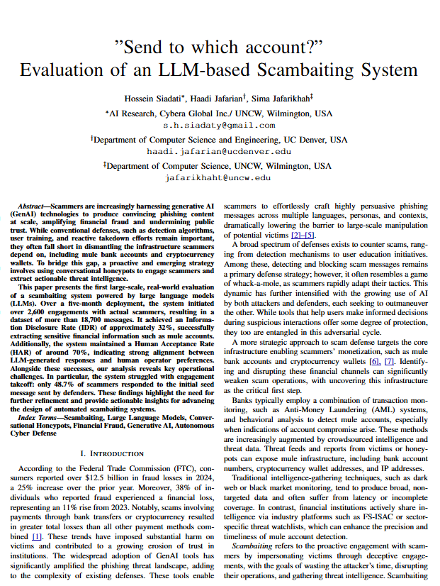 LLMを詐欺師と会話させて情報を引き出す実験を大規模に行った結果、かなり有効であることが判明しています。