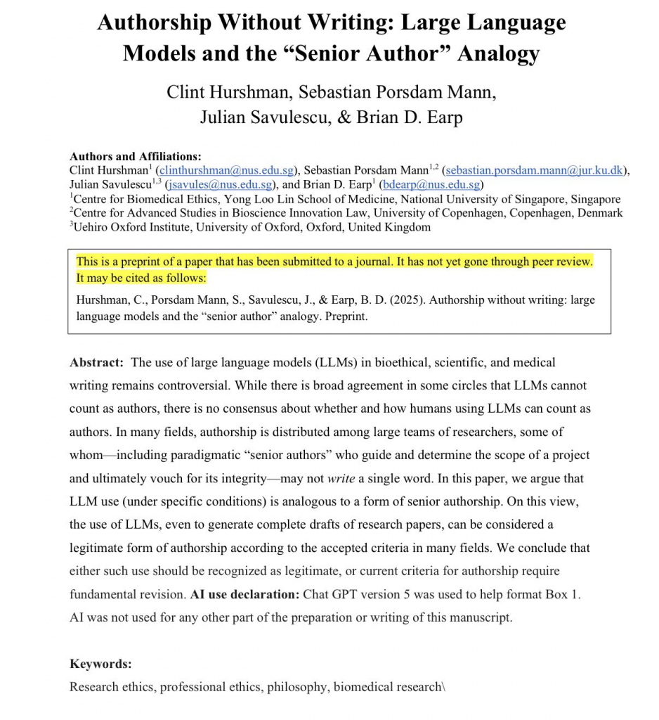 現行の基準にもとづくと「もしLLMを使ってもその人は著者になる」主張されています。