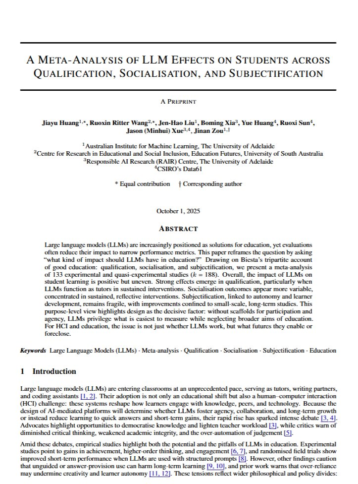 A Meta-Analysis of LLM Effects on Students across Qualification, Socialisation, and Subjectification