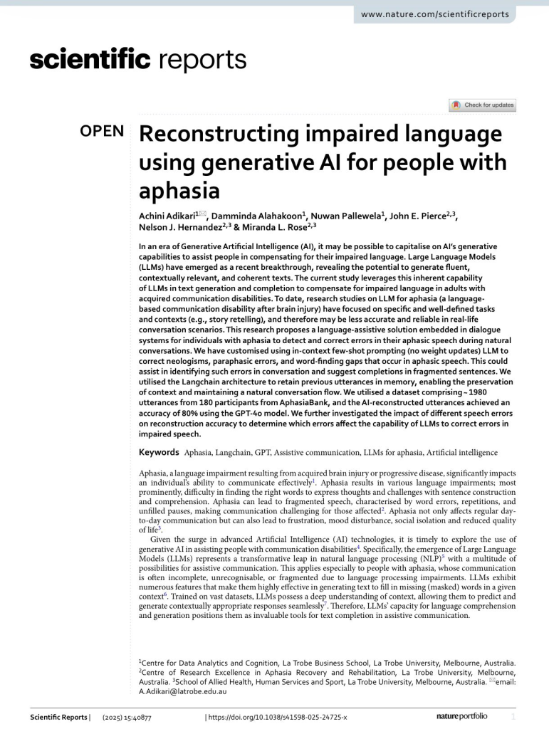 LLMを使って、失語症(言葉がうまく出てこなくなる症状)の人の途切れ途切れの発話を正しい文に直せるかどうかを調べたところ、約8割の精度で発話を復元できたそうです。